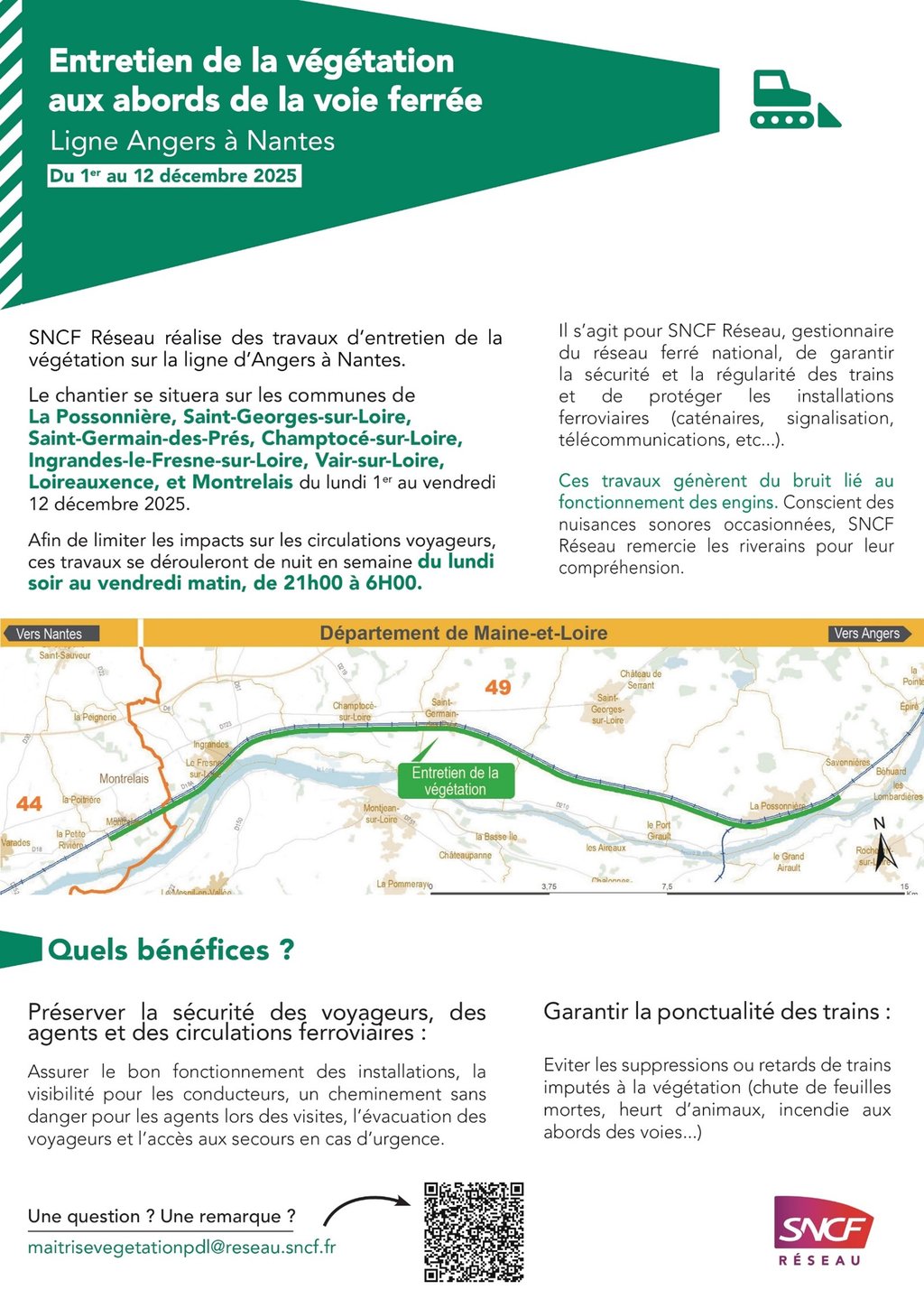 Le chantier se situera sur les communes de La Possonnière, Saint-Georges-sur-Loire, Saint-Germain-des-Prés, Champtocé-sur-Loire, Ingrandes-le-Fresne-sur-Loire, Vair-sur-Loire, Loireauxence, et Montrelais du lundi 1er au vendredi 12 décembre 2025.